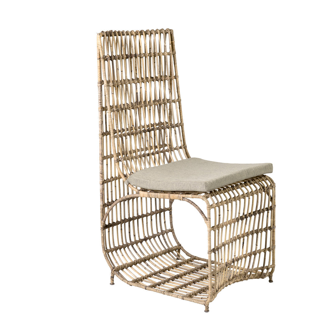A sculptural piece that fits right into your dining room, handcrafted from woven rattan on an iron frame. This dining chair features a taupe cushion for optimal lounging comfort, and a shape that is truly unique for your space.