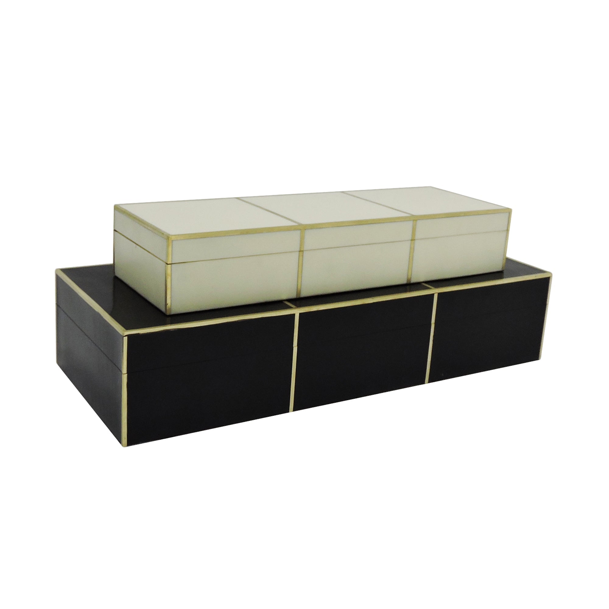 A statement duo featuring beautiful black and white boxes accented by brass geometric details. This decorative box set offers practical discreet storage, perfect for organizing keys, your favorite jewelry or small personal items. With modern lines and a contemporary look, this home decor set has a hint of the 40s Art Deco style, adding a touch of sophistication to any living space.