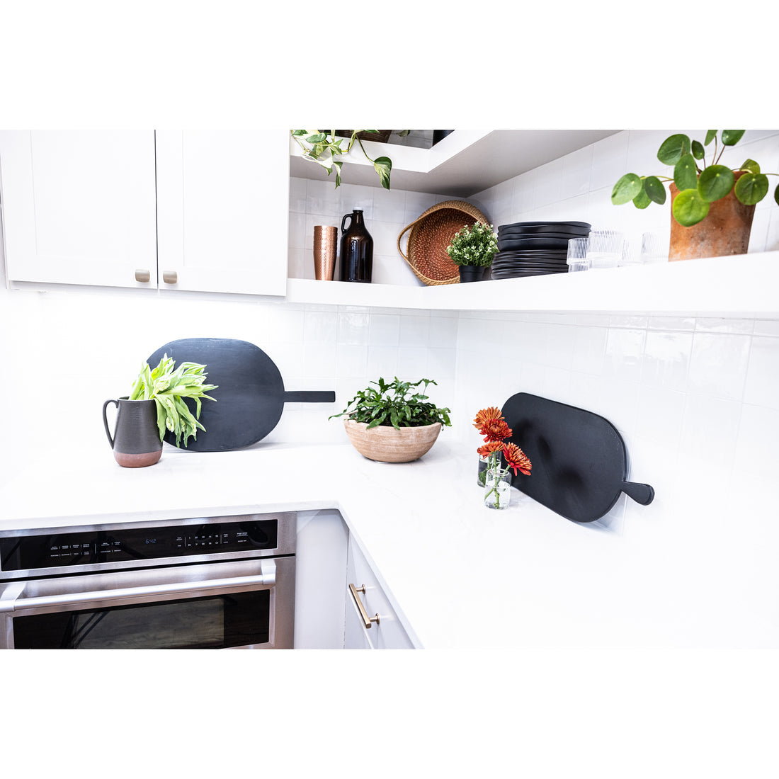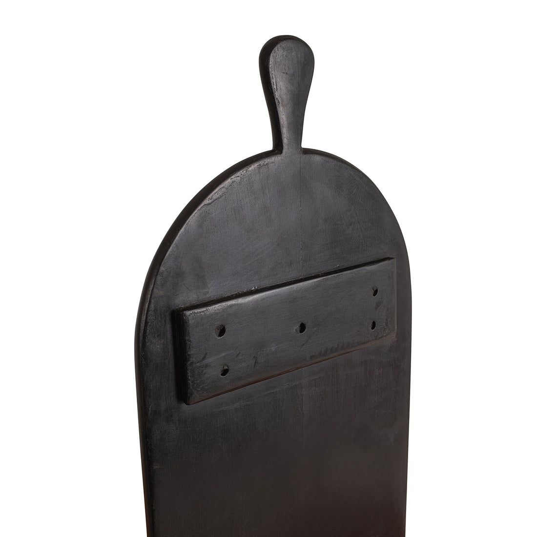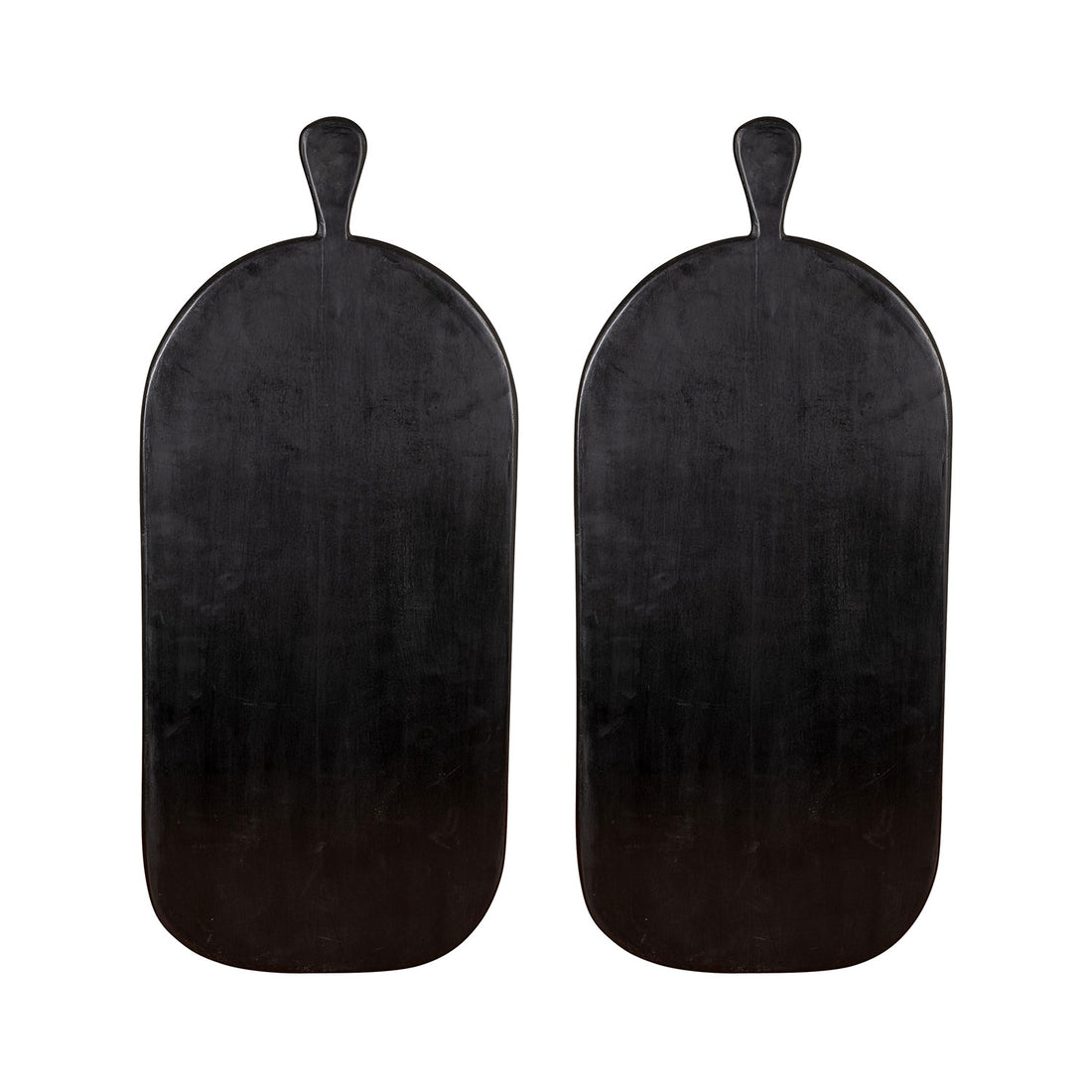Natural wood serving boards are finished in a rich, satin black for an organic, minimalist look. The elongated shape and small scale create a bold, sculptural silhouette. Display on open shelves in the kitchen, or feature in a styled tablescape.