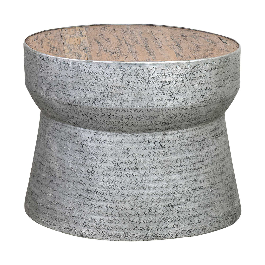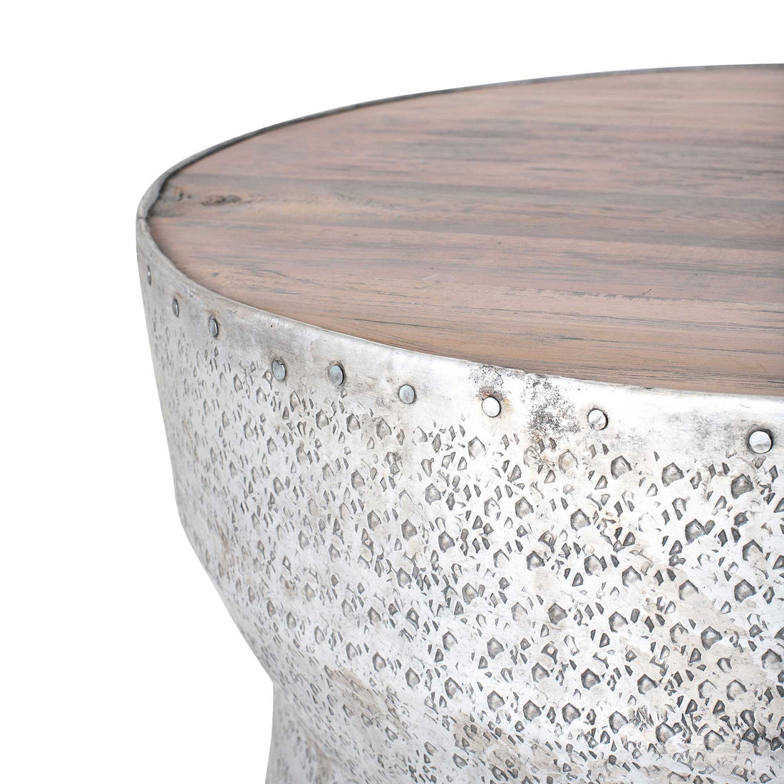 New uses for timeless materials is something we're very proud of here at East at Main. Hammered metal is shaped into a bold, organic hourglass silhouette and paired with a slice of natural teak wood, adding global, contemporary, flair to any living space.