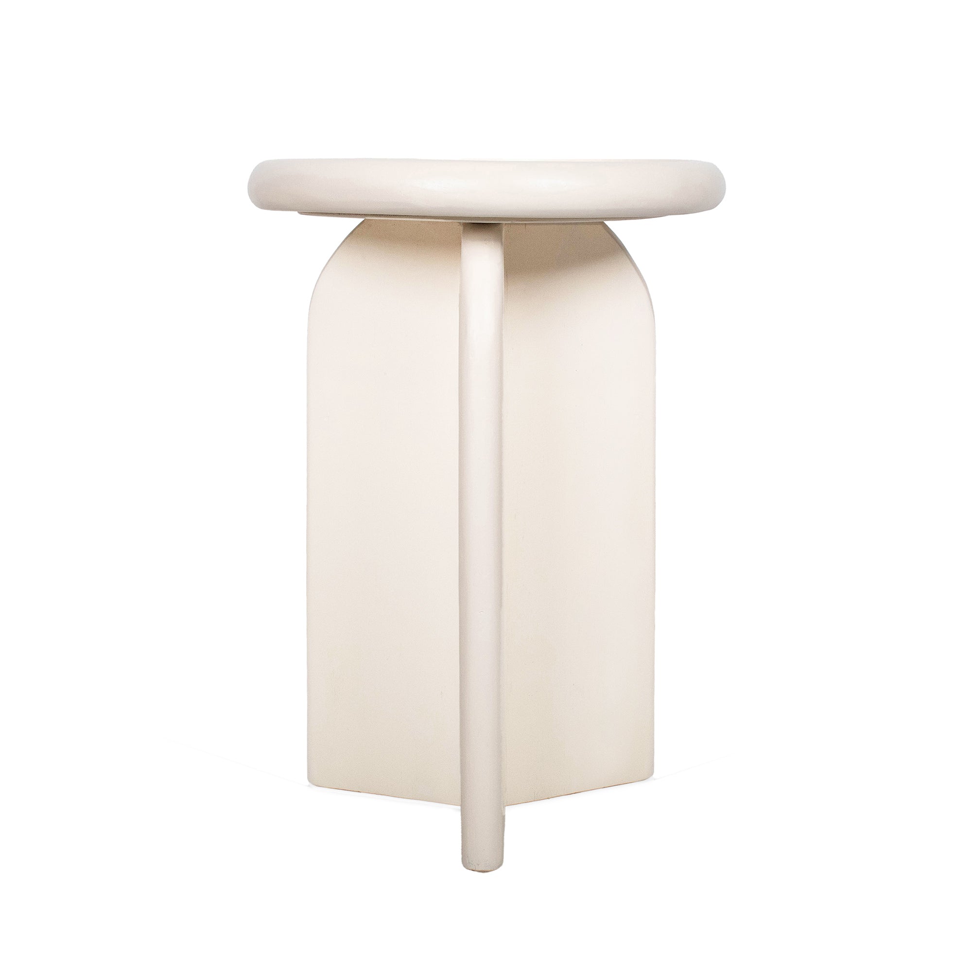 Crafted from solid munggur wood, with a unique minimal round, geometric shape that combines modern, clean lines with gently rounded bullnose edges. The natural materials and white sand finish have an organic warmth, while the craftsmanship ensures a one-of-a-kind character. A blend of simplicity and modern design, making it a conversation piece that complements any space.