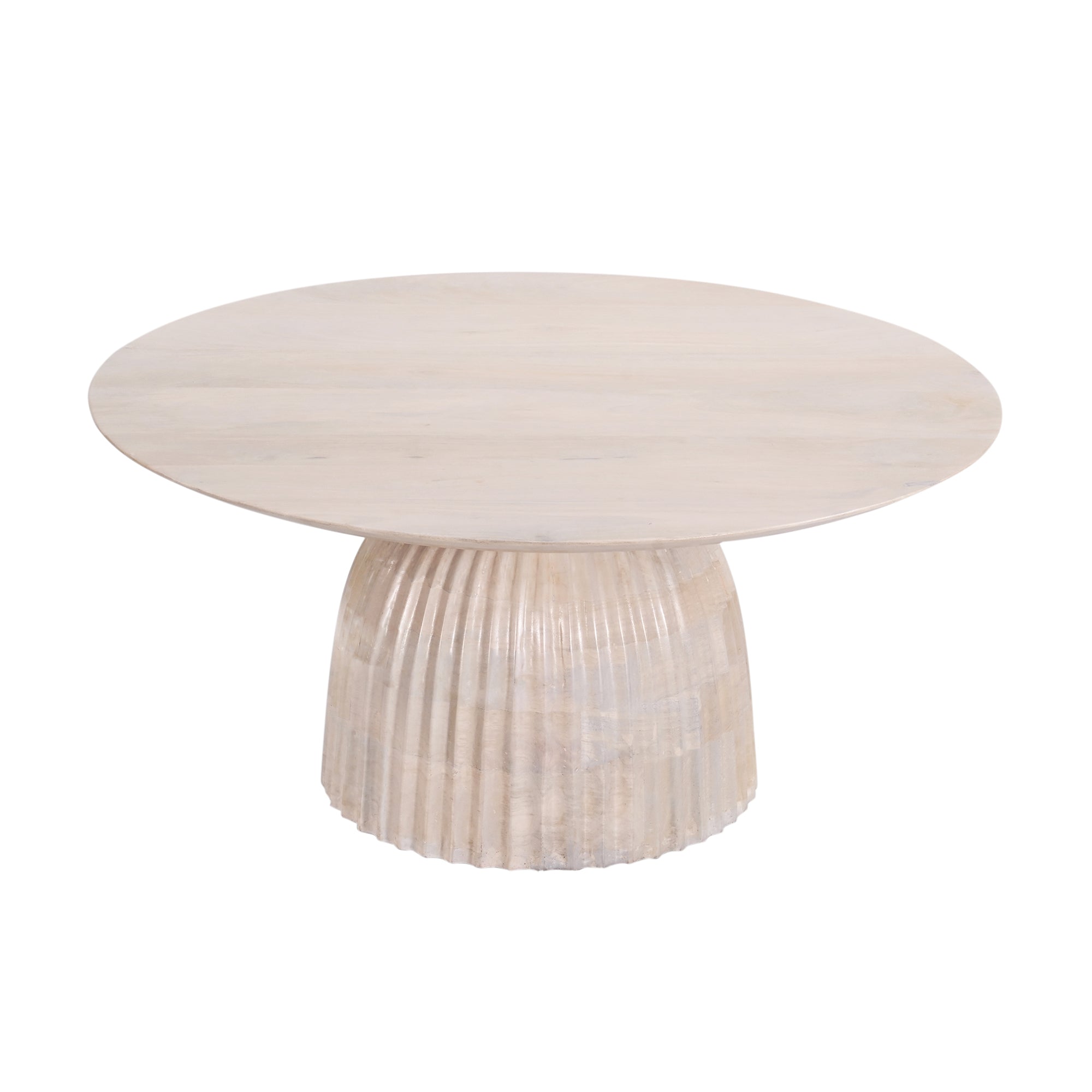 A work of functional art and affordable luxury, this scalloped base coffee table makes a statement in any living space. Crafted from mango wood and finished in a soft white washed hue, with a unique, ridged texture that enhances the visible wood grain and minimal, round silhouette. This modern, global style coffee table pairs effortlessly with the matching accent table to create a cohesive and stylish look. Due to the natural materials and artisanal processes involved, each piece boasts its own unique variations in wood grain and color, enhancing its one-of-a-kind charm.