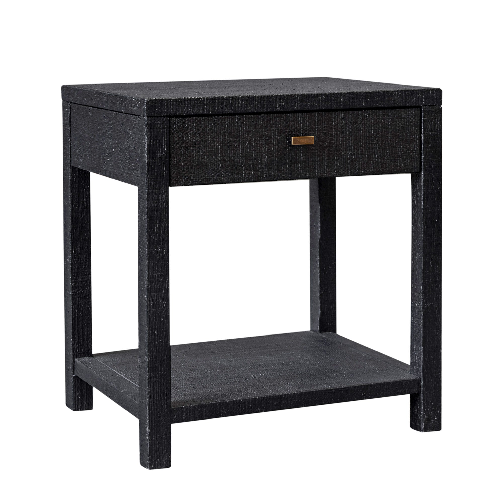 Wrapped in natural raffia, hand finished in timeless black or natural color, this tailored nightstand has elevated coastal charm and modern functionality. Handcrafted from solid Bayur wood, the bedside table includes a single drawer for concealed storage, accented by metal drawer pulls with an antique brass patina. The open shelf provides an ideal showcase for your favorite home accents, while the woven artisan texture and organic design add a touch of relaxed sophistication to any bedroom. This nightstand offers both sytle and storage and seamlessly bridges traditional, transitional, and contemporary styles.