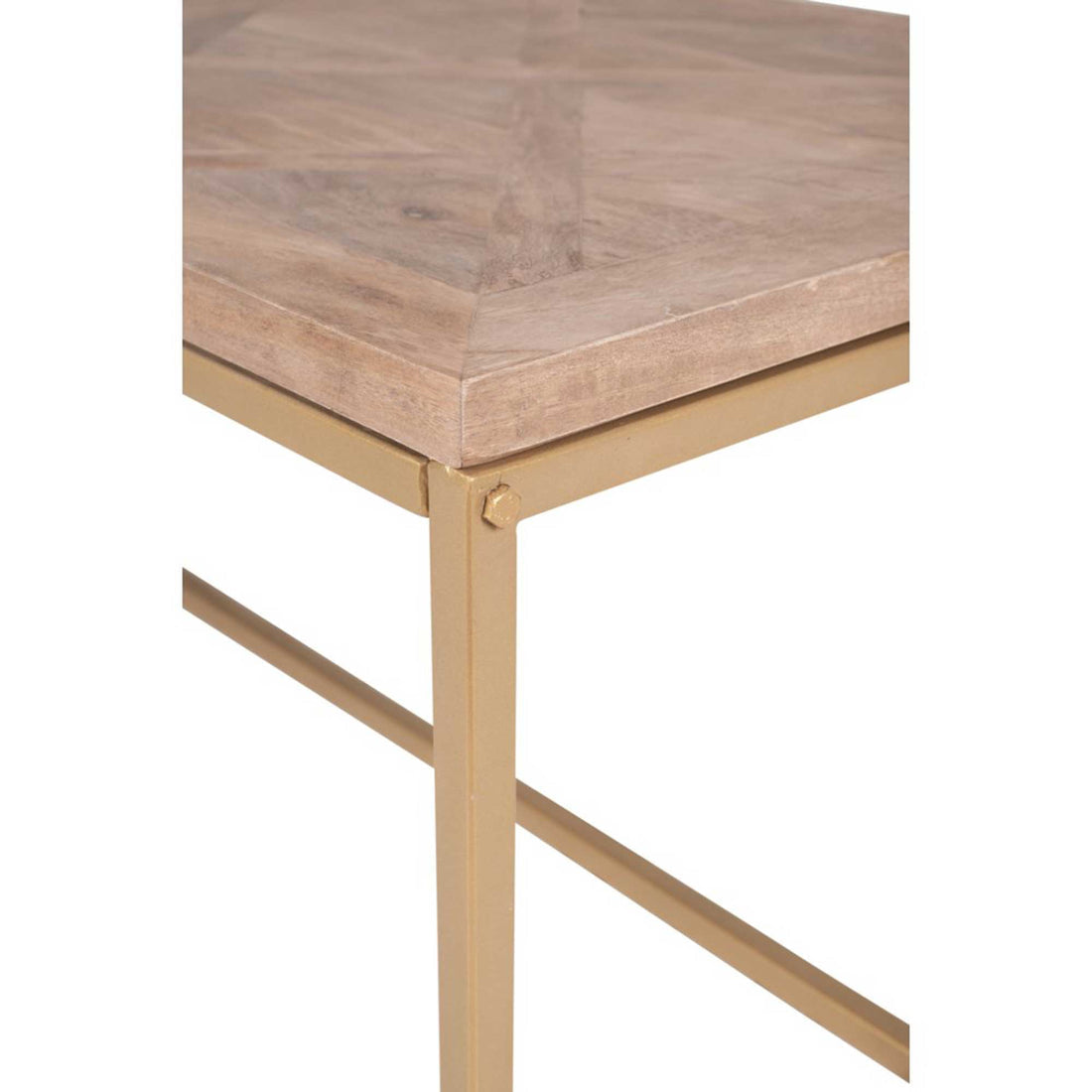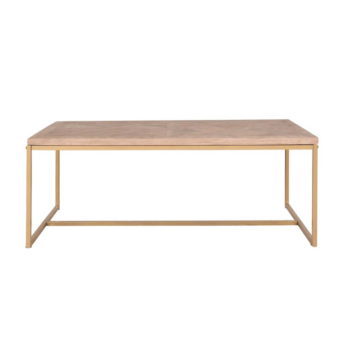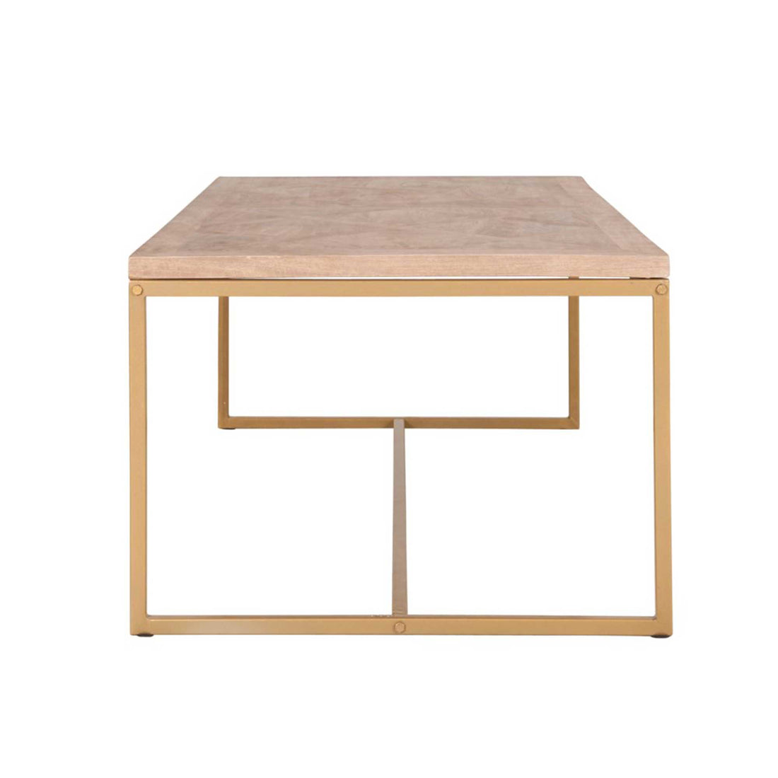 The Hart Coffee Table adds a touch of sophistication to the living room. Featuring a parquet mango wood top and a minimalist gold frame, this coffee table offers ample space with a 47.25" tabletop. Perfect for adding large coffee table books and chic decor.