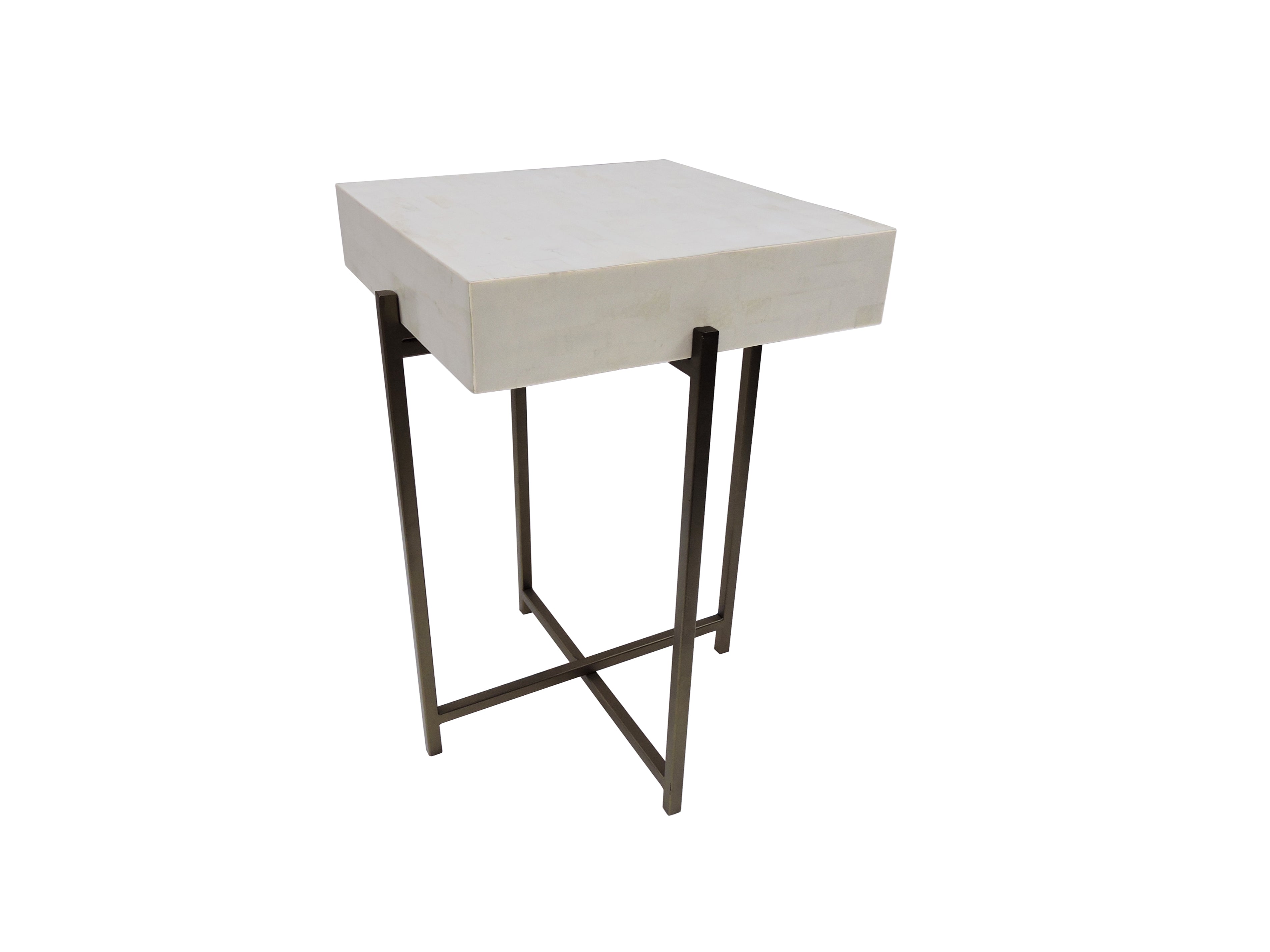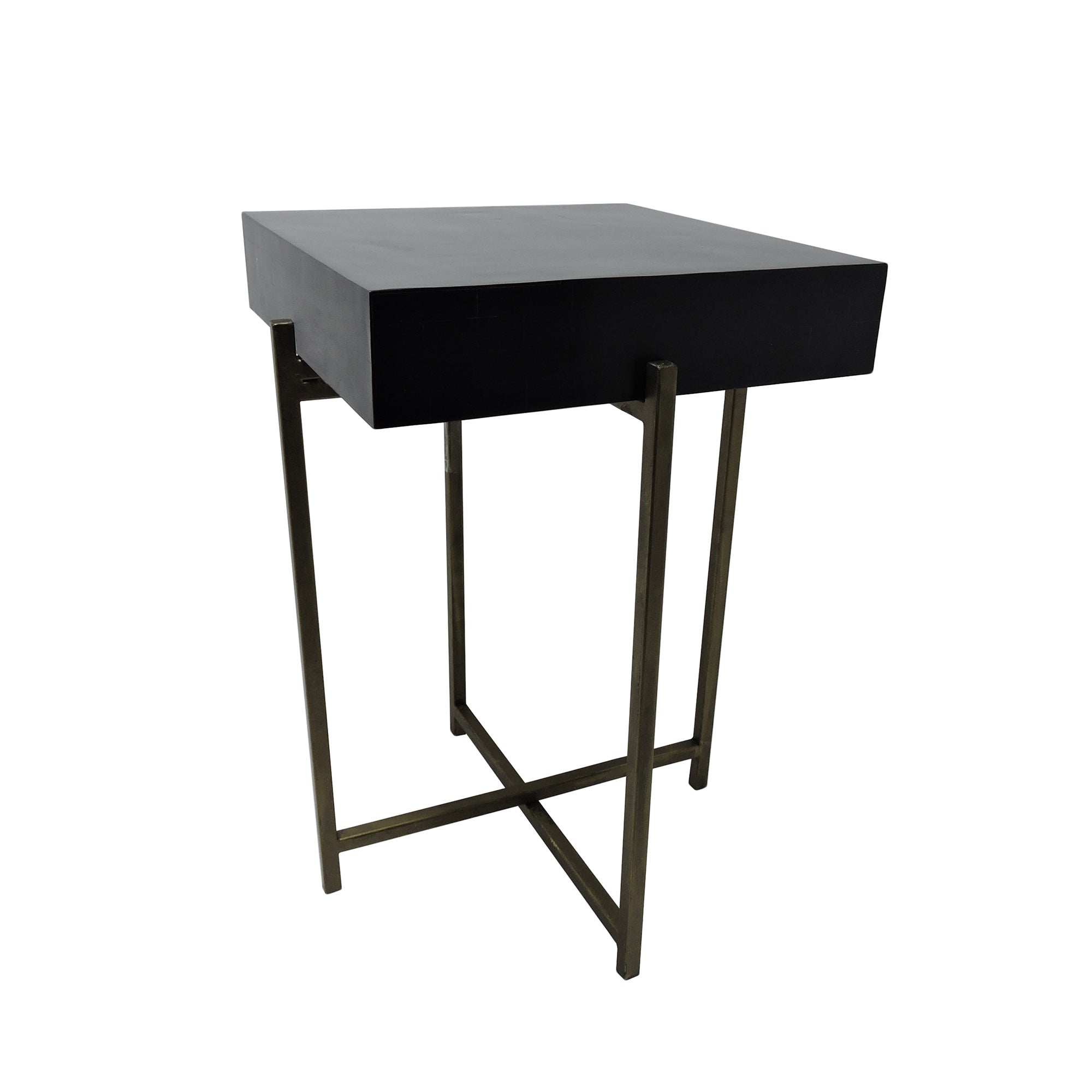 This sleek and modern accent table boasts a crossed gold metal base supporting a modern box tabletop available in either luxe white or black resin. The hand-inlaid polished resin tiles that create the tabletop surface add an artisan crafted detail to your living space. The contemporary look of this end table has a hint of 40s Art Deco style to elevate your home with a blend of simplicity, affordability and everyday luxury.
