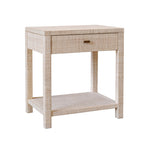 Wrapped in natural raffia, hand finished in timeless black or natural color, this tailored nightstand has elevated coastal charm and modern functionality. Handcrafted from solid Bayur wood, the bedside table includes a single drawer for concealed storage, accented by metal drawer pulls with an antique brass patina. The open shelf provides an ideal showcase for your favorite home accents, while the woven artisan texture and organic design add a touch of relaxed sophistication to any bedroom. This nightstand offers both sytle and storage and seamlessly bridges traditional, transitional, and contemporary styles.