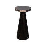 An elegant tapered wood pedestal base is topped with a slab of petrified wood that is as unique as a gemstone. The fossilized wood is created when a tree has completely transformed into stone over many years and retains its original structure. A hand-polished finish brings out all the unique natural striations and color variations of the material and contrasts the organic warmth of the munggur wood base. Available in two versatile colors: natural or black, this accent table is the perfect balance of simplicity and bold, contemporary design. Due to the nature of materials expect some variation in color and form, which adds to the beauty of each piece.