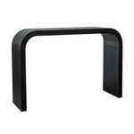 An ultramodern design in a sleek black ebony finish with organic arched form reflects a postmodern influence reminiscent of minimalist 80s style. This console table, with its round, curved silhouette and linear simplicity, embodies contemporary sophistication, making it a perfect addition to any modern or eclectic living room or dining space. The slim profile, at just 15" deep, is ideal to add function to small areas like a narrow entryway or at the back of a couch.
