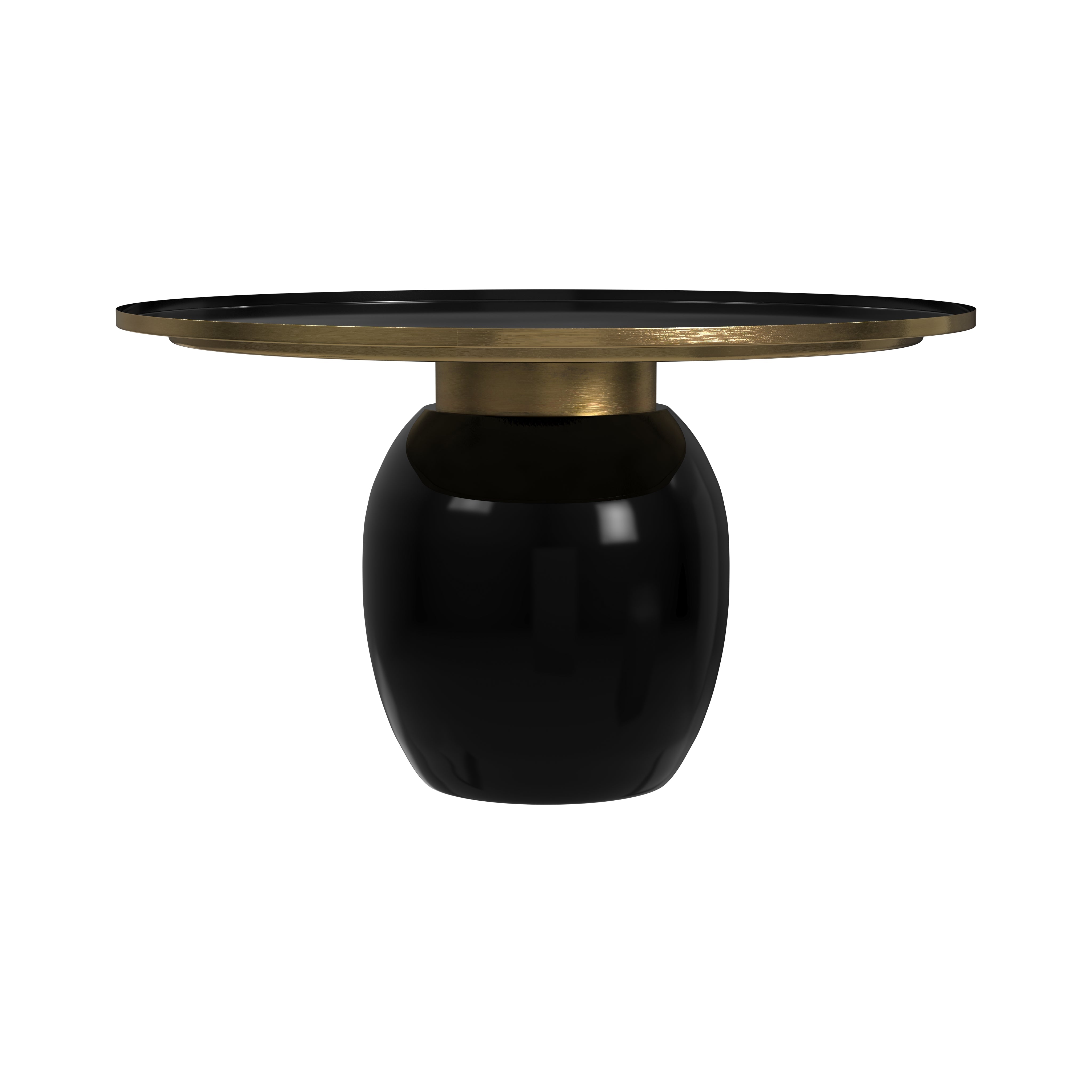 A luxe enamel finish in rich black gives dimension and glamorous shine to this sculptural coffee table. The curved, vase-shaped base and round tray tabletop feature gold detailing to add a modern touch of '70s glam to your living room. Perfectly scaled for smaller living spaces or paired with a matching side table for a bigger style statement.