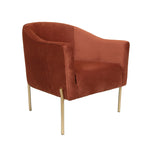 A perfect blend of style and comfort, this modern club chair features simple, solid metal legs with a gold finish and rich cinnamon velvet upholstery. These accent chairs take inspiration from chic hotel lounges, with a hint of 40s Art Deco styling. Add distinctive everyday luxury to your living room, home office, or glamourous dressing room.