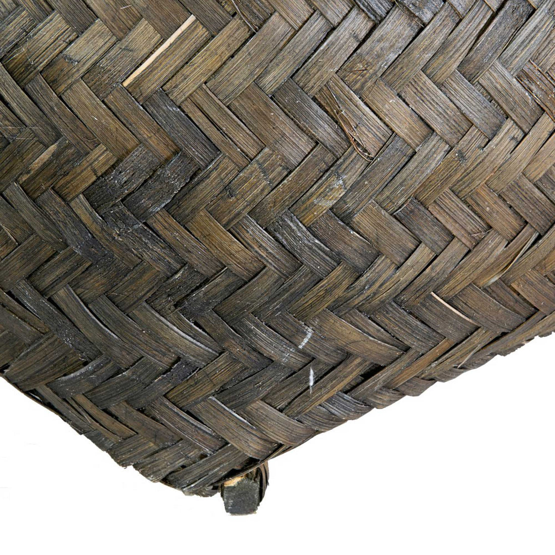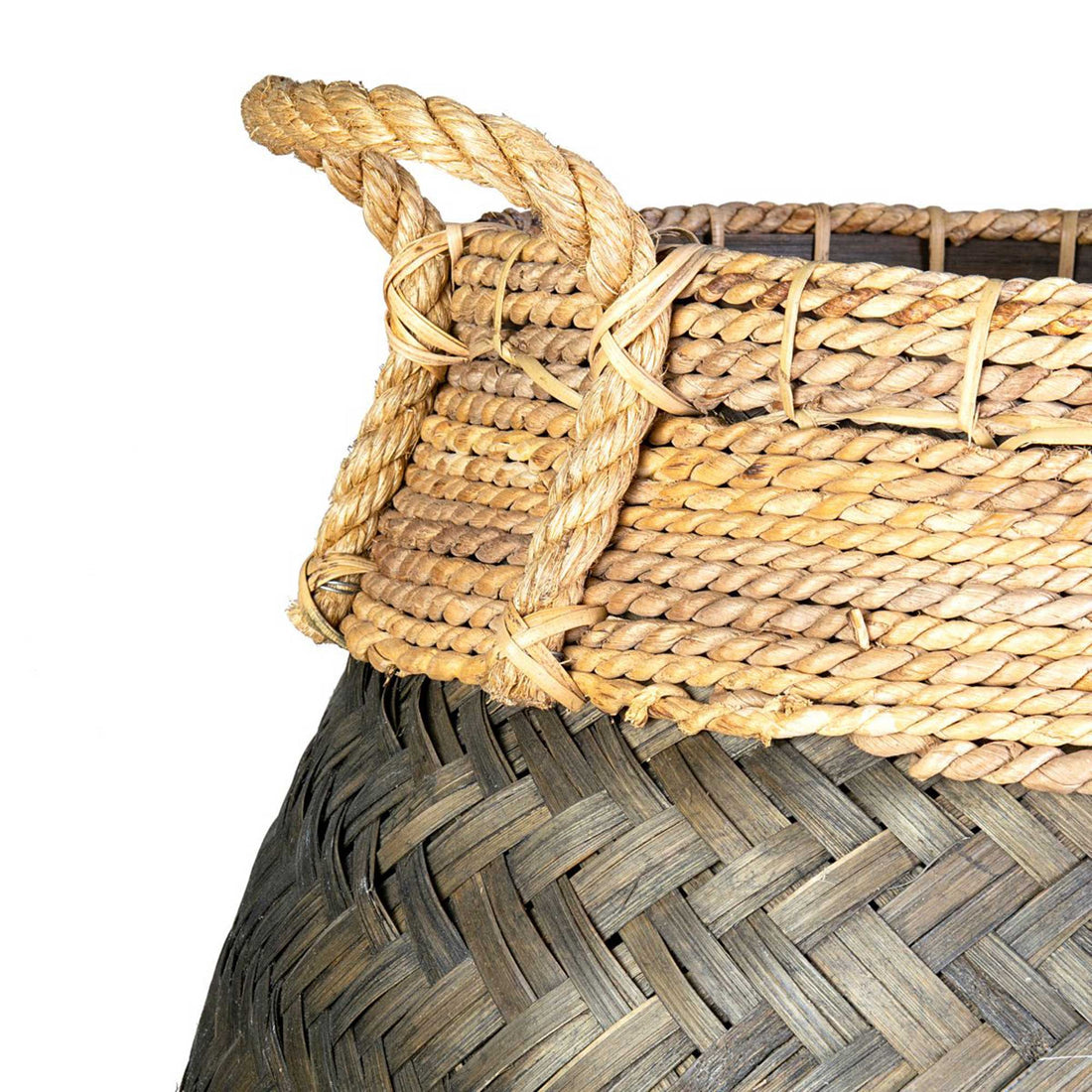 Storage and style. Organic, sculptural forms and texture of mixed natural materials give these handwoven baskets a modern rustic look. Made from sustainable woven bamboo and abaca with a soft wash and topped with a decorative band of natural brown coiled reeds and rope handles.