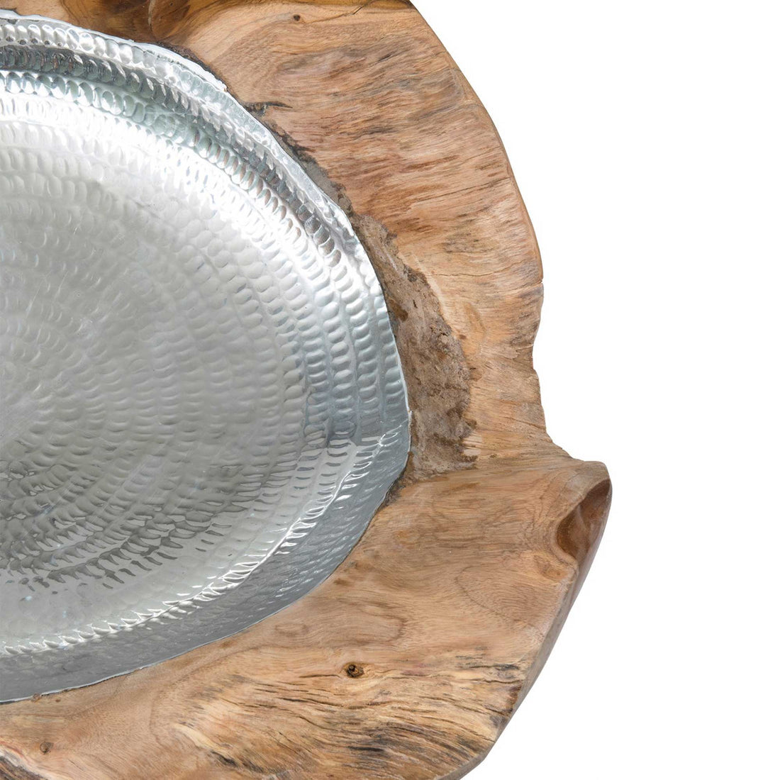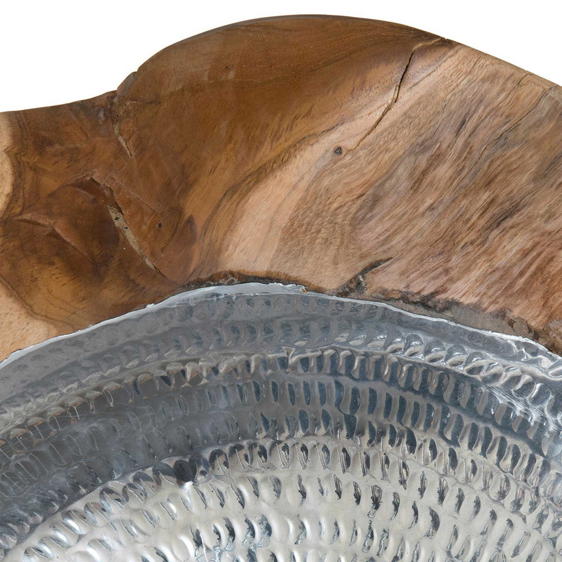 An organic modern statement piece, this unique bowl is carved from solid teak wood and inlaid with delicately hammered aluminum. The natural, irregular outline of the teak's live edge, and rich texture of the wood grain are showcased in beautiful contrast to the subtle sheen of the metal interior. Each modern, rustic bowl is completely one of a kind, and makes an elegant centerpiece for any table or countertop.