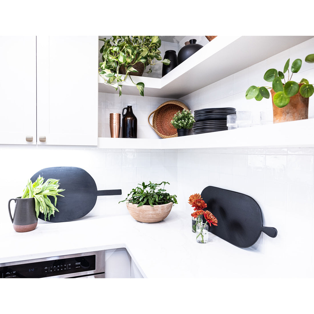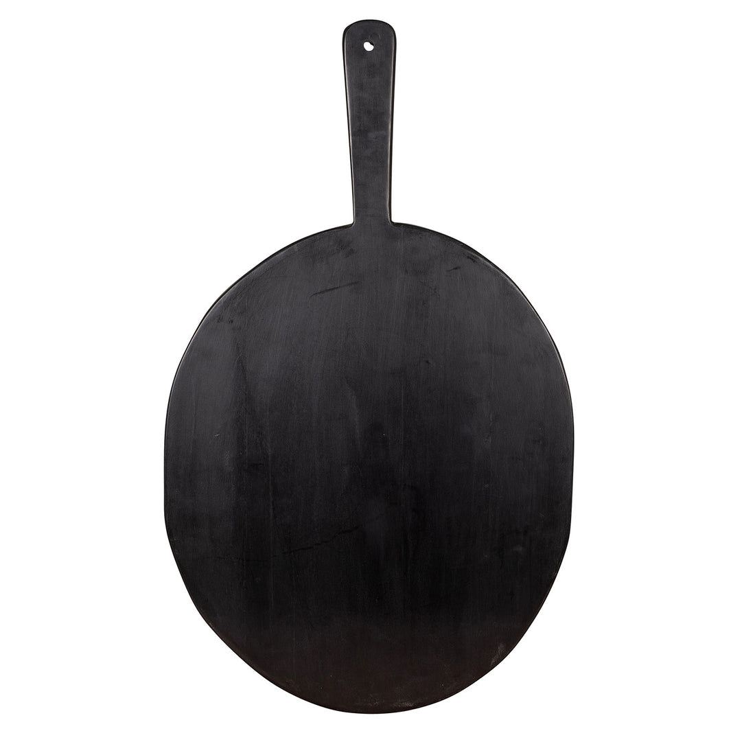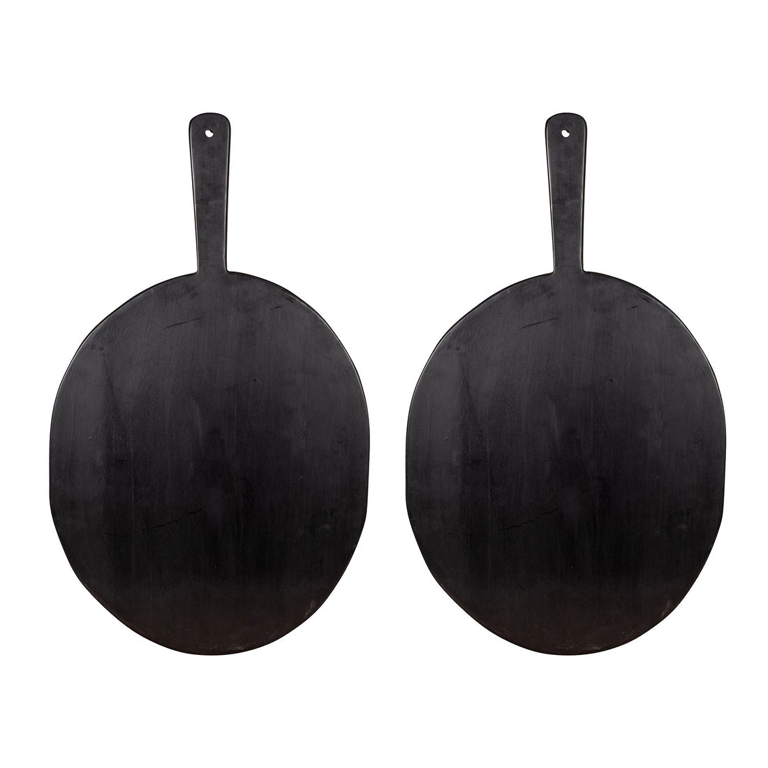 Natural wood serving boards are finished in a rich, satin black for a modern, rustic look. The organic oval shape makes a striking, minimalist accent piece for the table, countertop display, or even hung on the wall as decorative art.