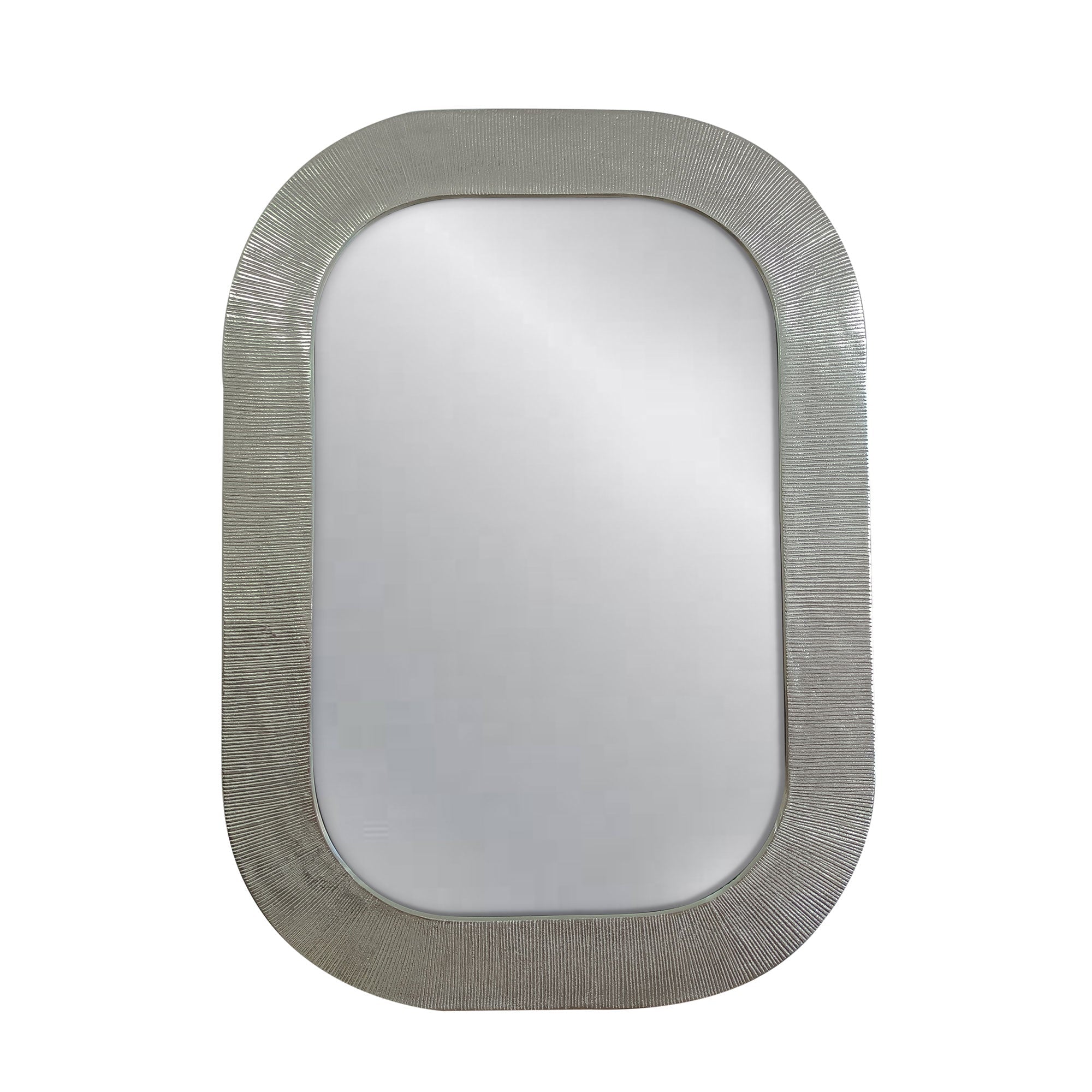 Hand-casted with an artisan touch, the nickel-finished metal mirror frame features an organic, ridged surface texture in an antiqued silver tone. With modern, curved edges, this rectangular mirror is a true statement piece at 36" in height. The large scale and handcrafted details make this mirror an impressive piece over your living room mantle, bedroom or powder room vanity, or as dimensional, light reflecting wall decor in your entryway.