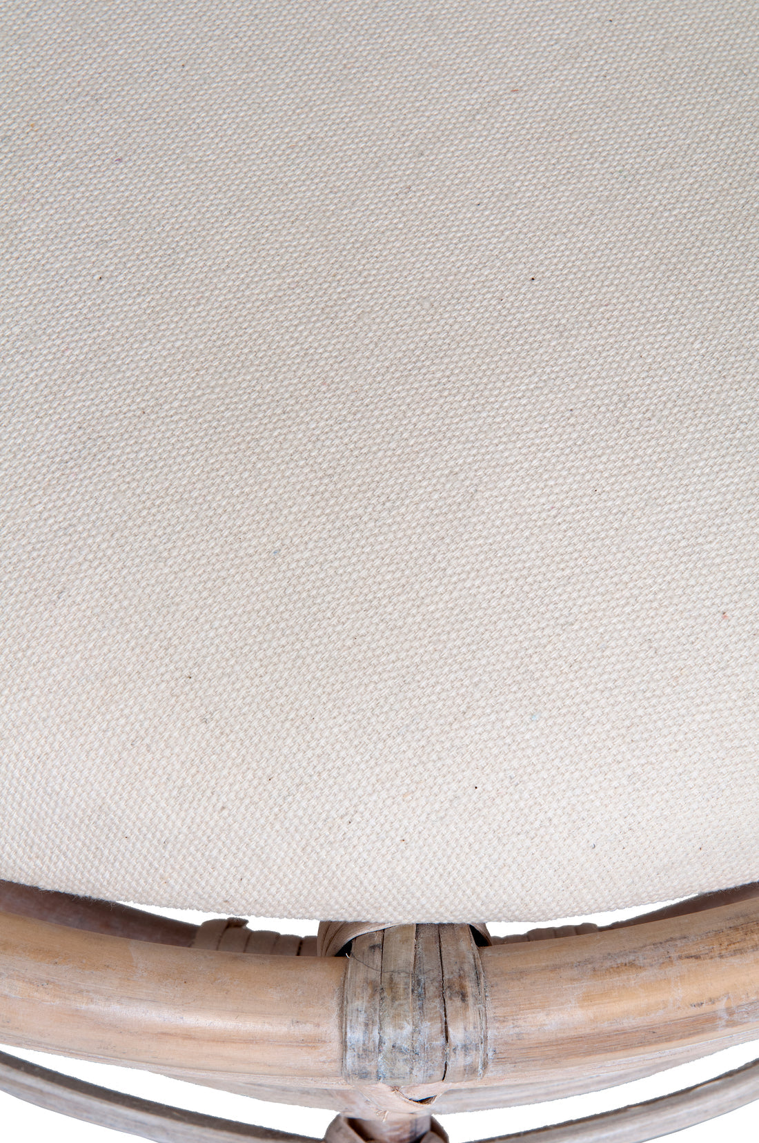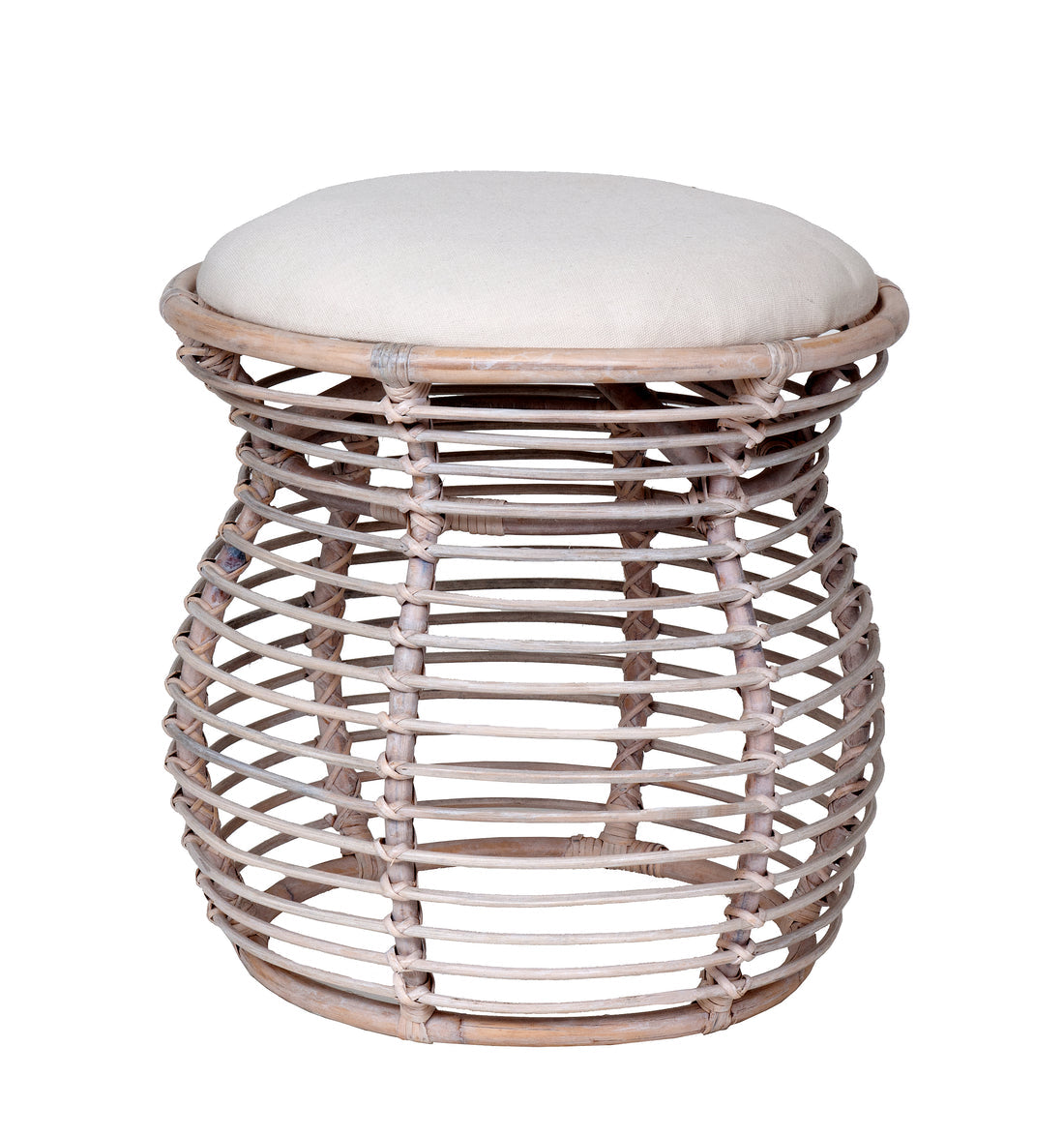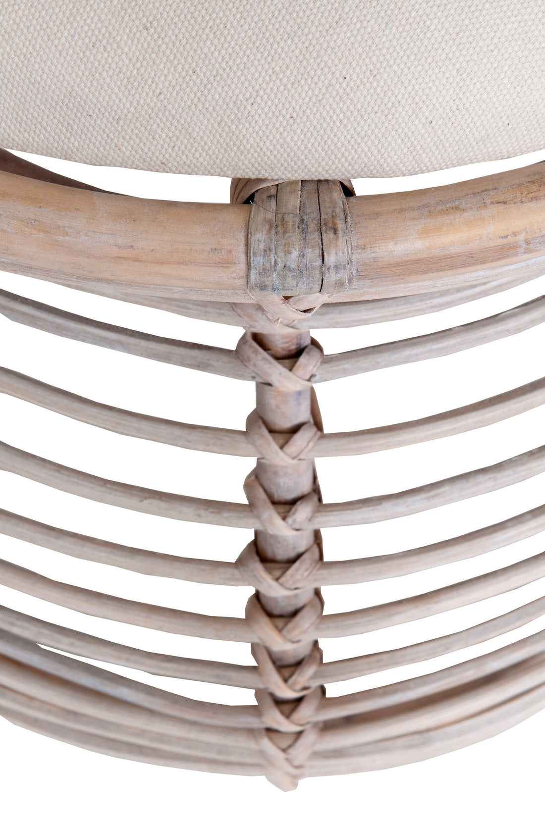 With its whitewashed rattan base and upholstered inset cushion, The Dickerson stool has a casual and relaxed look. Rattan core is soaked and bent to create its sturdy, rounded shape, while strips of rattan peel create a detailed cross wrapped look.