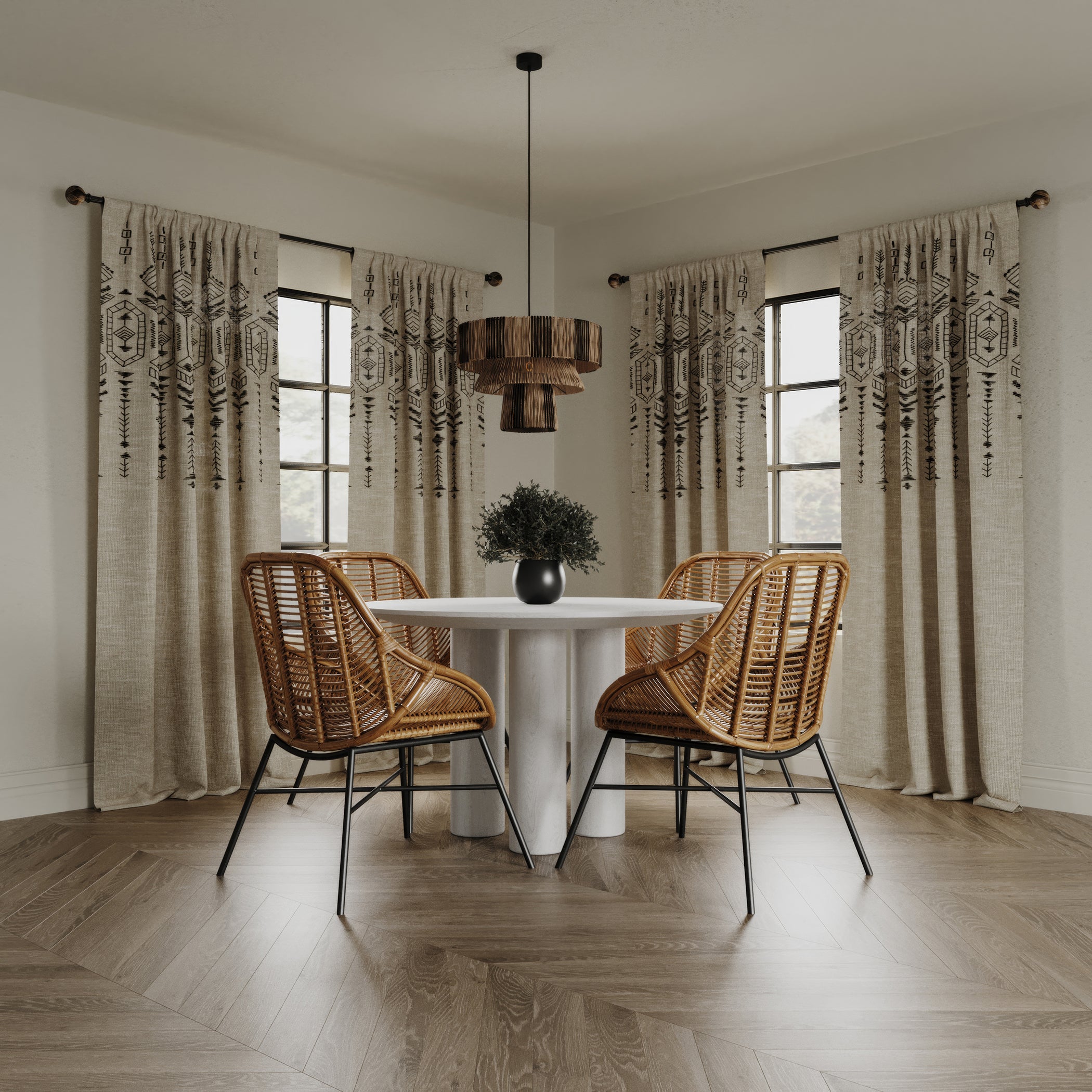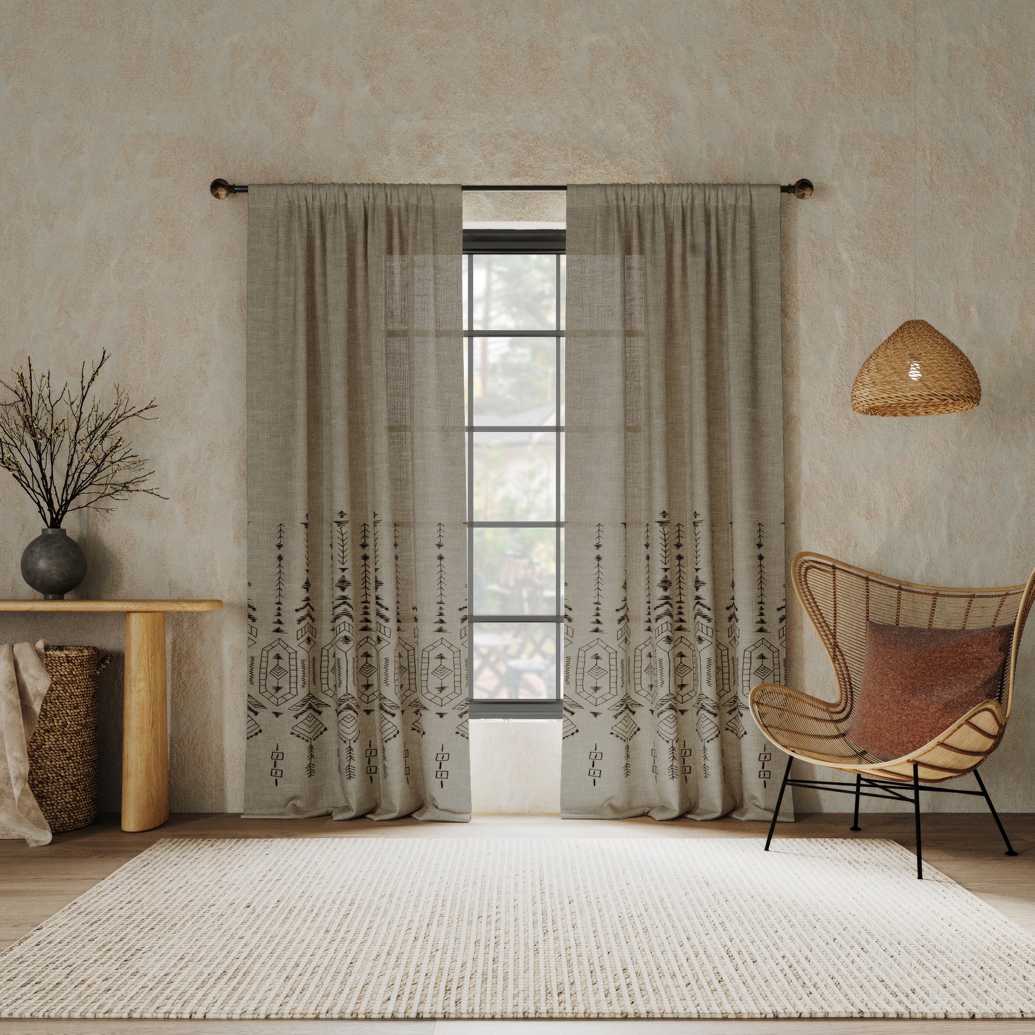 Bring luxury and comfort to everyday living with the Palo Curtain by Indigo Road, a brand founded by renowned designer, HGTV star, and real estate broker Egypt Sherrod. Guided by her belief that your home should feel good from the inside out, this midweight semi-sheer curtain offers a soft and airy aesthetic that beautifully filters light. It features intricate embroidery with global-inspired motifs, including geometric shapes, abstract lines, and botanical patterns reminiscent of traditional artisanal designs from around the world. The delicate detailing adds a touch of bohemian sophistication, making it an ideal choice for eclectic or globally inspired interiors. For easy installation on rods up to 1 ½” in diameter, each panel features rod pockets on each hem, making the design reversible. To care for your curtain panel, machine wash cold on gentle cycle, using non-chlorine bleach when needed. Tumble dry on low heat, using a cool iron as needed.