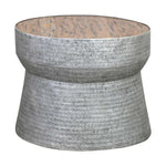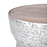 New uses for timeless materials is something we're very proud of here at East at Main. Hammered metal is shaped into a bold, organic hourglass silhouette and paired with a slice of natural teak wood, adding global, contemporary, flair to any living space.